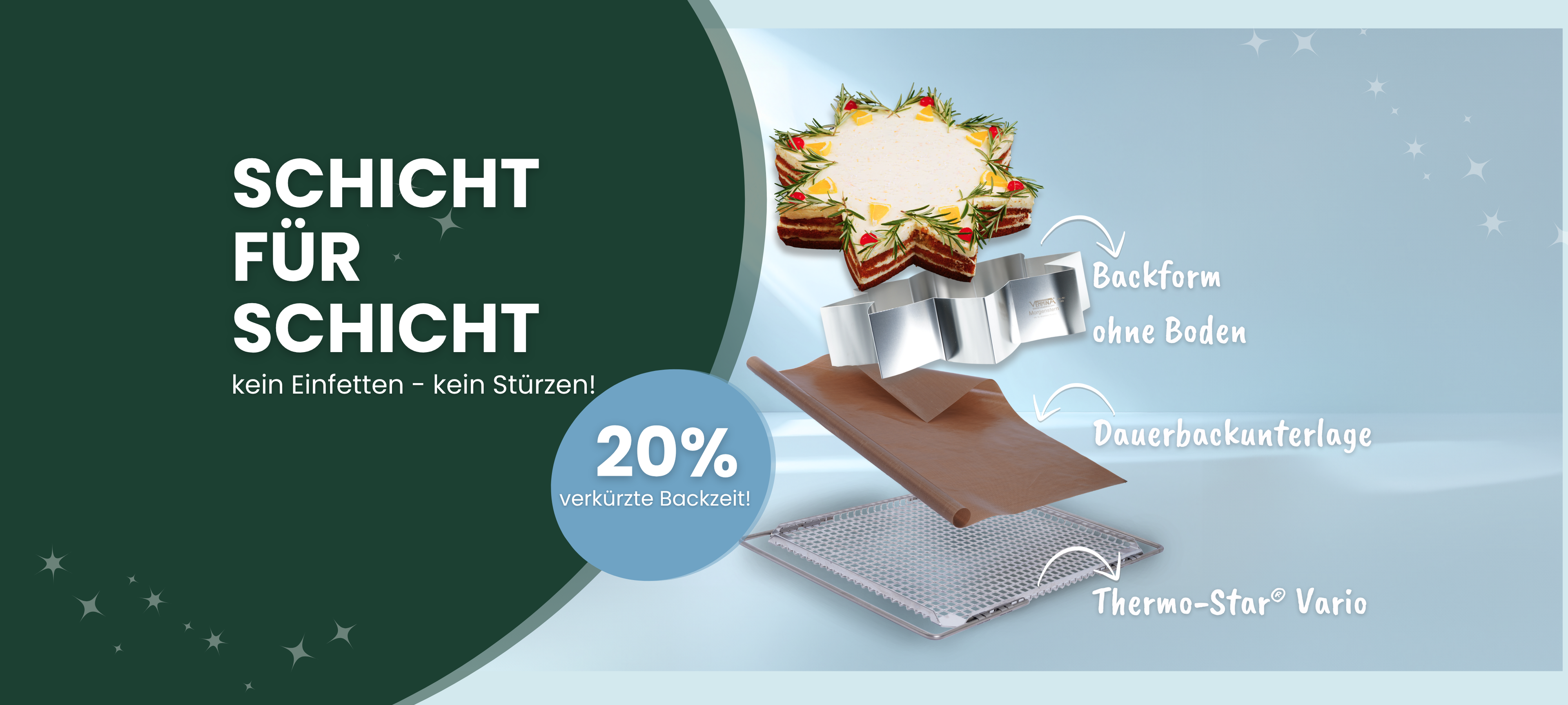 Mit dem Thermo-Star® Vario Rost kommt die warme Luft ideal an den Teig und die Backzeit wird bis zu 20% verkürzt. Der Backofenrost ist eben, spannungsfrei und bleibt bei Temperaturschwankungen formstabil, was das Auslaufen des Teiges verhindert. Für optimale Ergebnisse empfehlen wir die Verwendung unserer Dauerbackunterlage, die einen robusten Untergrund bietet und perfekt mit dem Backrahmen abschließt.