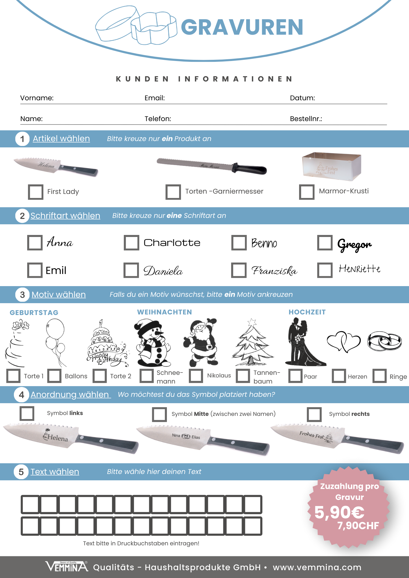 - Pro Gravur folgendes Formular ausfüllen (Formular ist auch im VEMMiNA-Dashboard)
